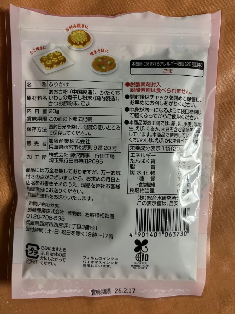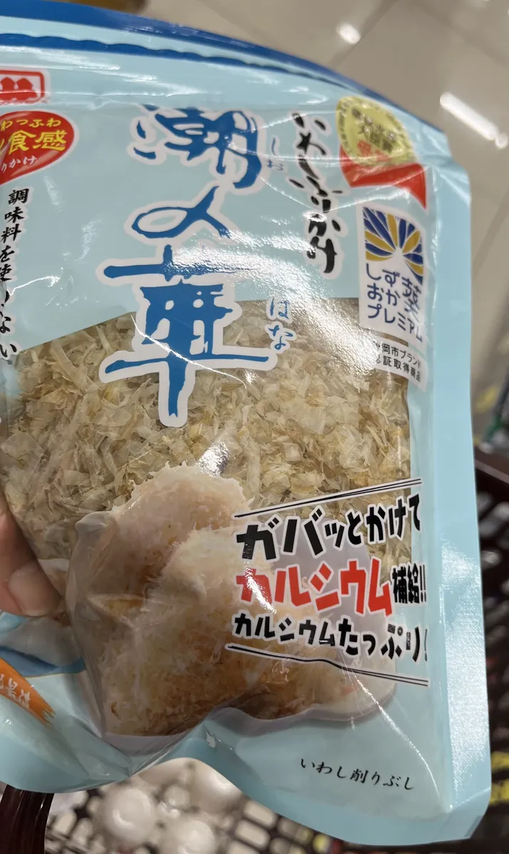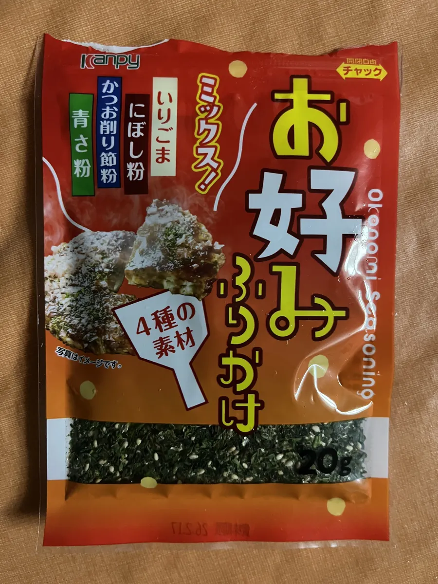 お好み焼きや焼きそばにかける用かも知れませんが、あおさたっぷり、にぼし粉・かつお削り節・いりごま入り。塩気が欲しければはぬちまーすをかけるかおしょう油を。添加物沢山のふりかけよりも良さそうです😅