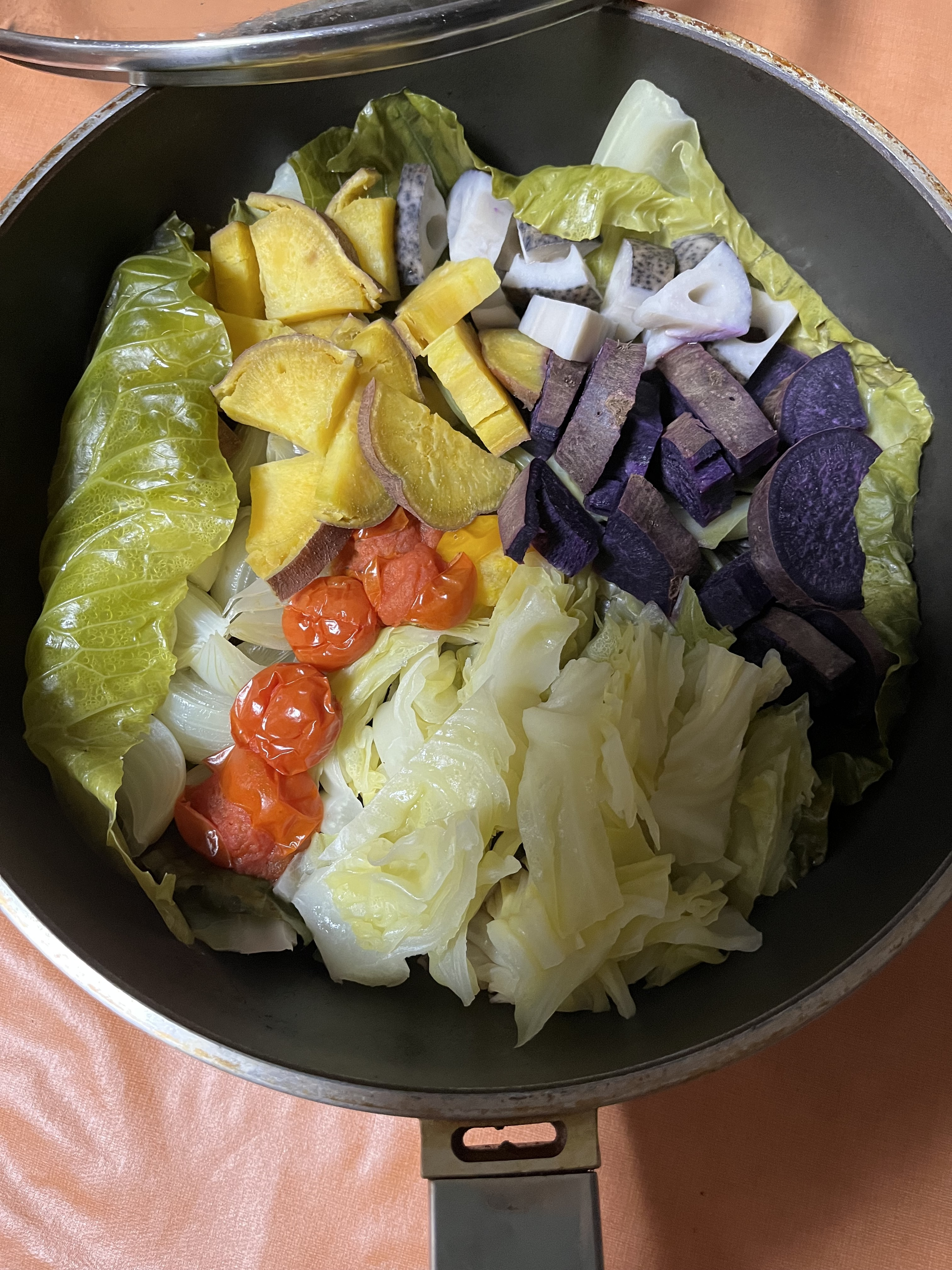キャベツの外葉🥬をクッキングシート代わりにして、キャベツ🥬・小玉ねぎ🧅・プチトマト🍅・れんこん・安納芋🍠・紫芋🍠をシンプルに蒸しました。
