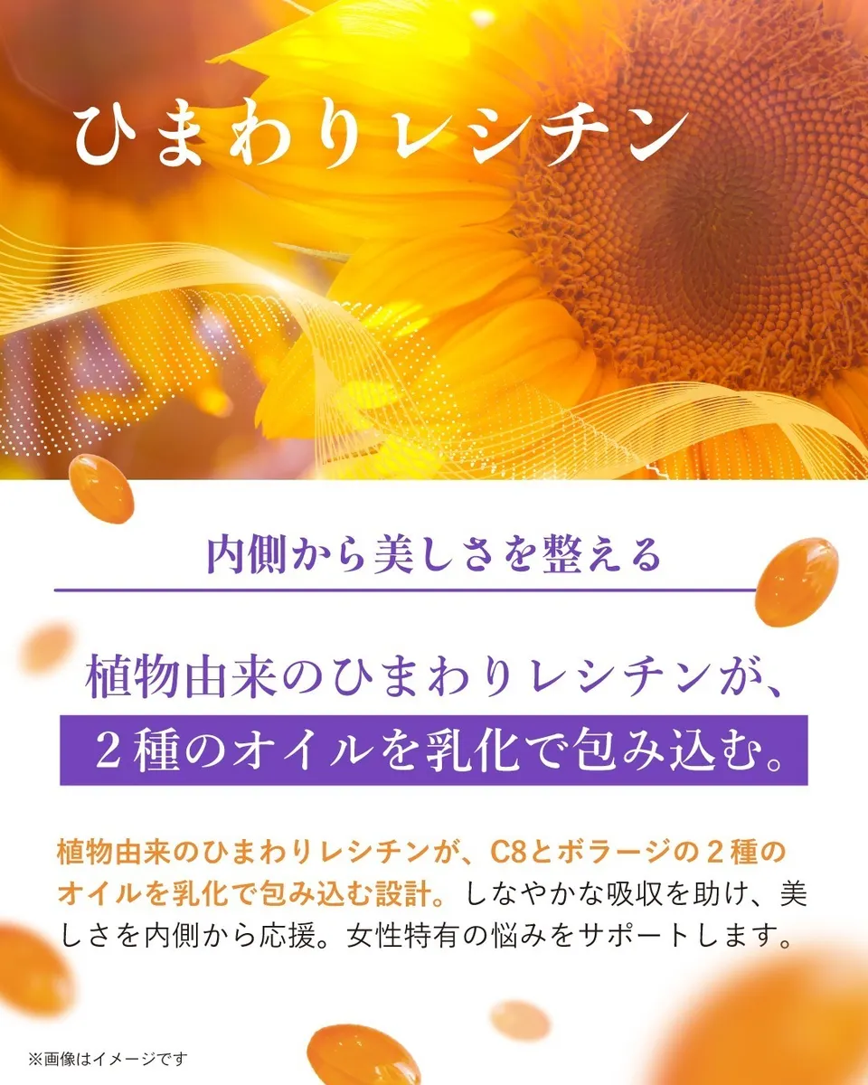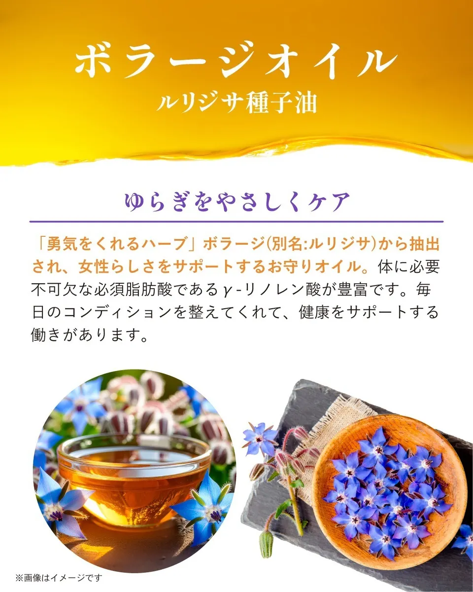 そんな女性特有のゆらぎや、繊細なリズムの乱れを、ボラージオイルに含まれる希少な成分(ガンマリノレン酸)が優しく包み込み、穏やかな毎日へと整えてくれます。