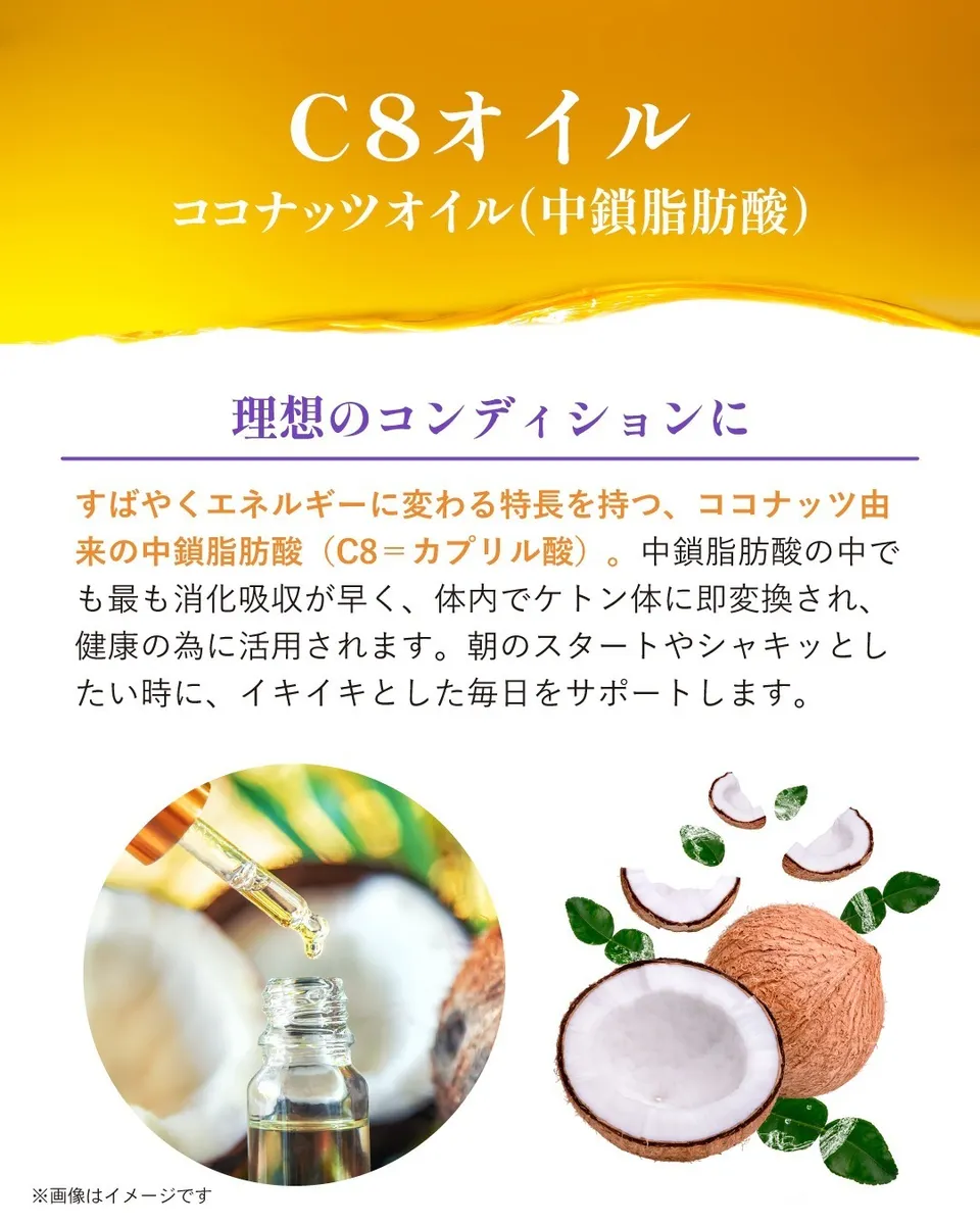 ルナビューティに配合された「C8オイル」は、脳に最短ルートで届く良質なエネルギー。