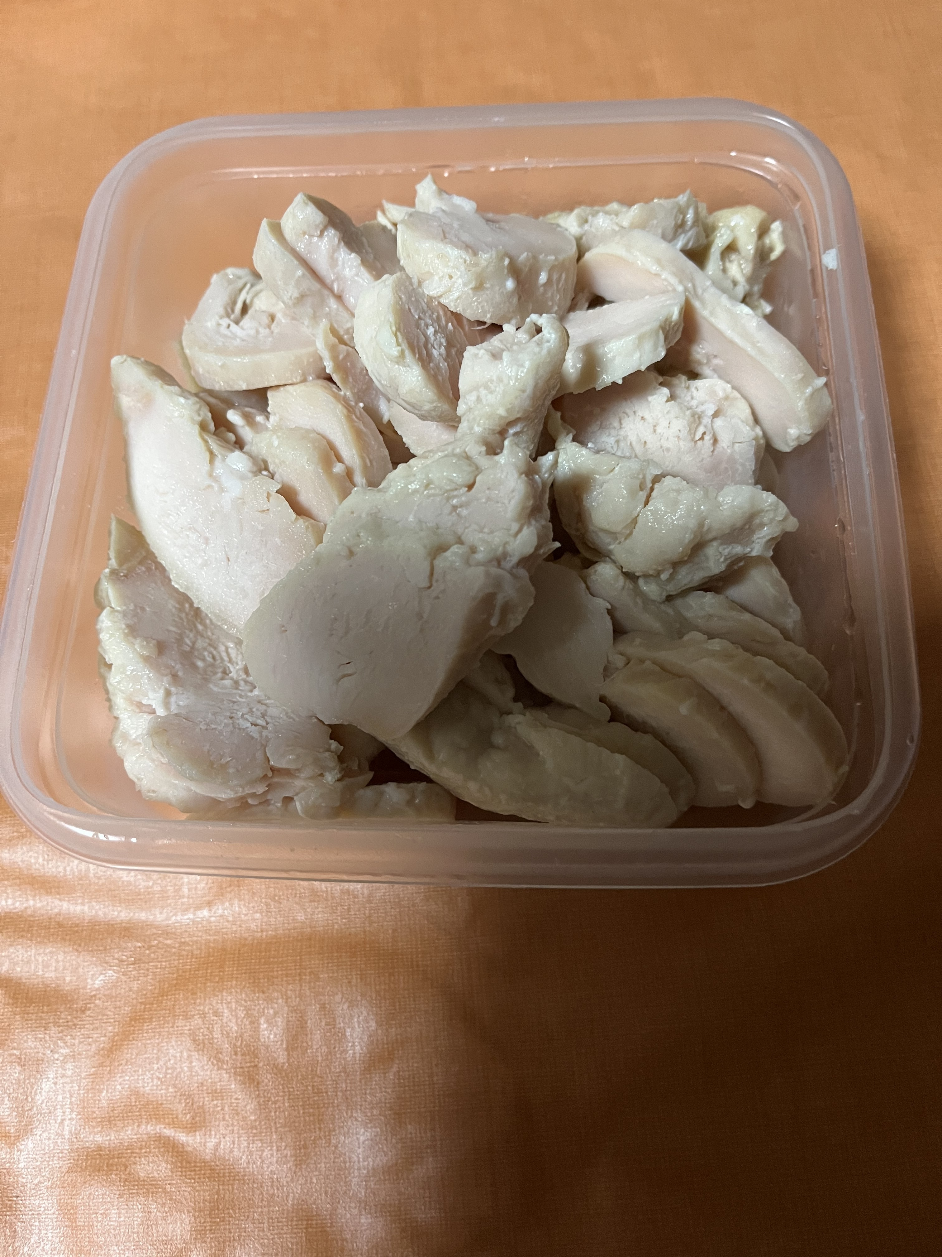 サラダチキンというのかチキンハムというのか🤔「タンパク質を摂りましょう」ということで、これ(当初は、胸肉をただ茹でただけだったので、多分栄養素も出てパサパサでしたが)とブロッコリー🥦と茹で卵🥚はお弁当のおかずの定番。事務職→現場の交替勤務で仕事もハードな1年でしたが、体重が小学生時の成長過程ででしか覚えのない40kg台前半になってしまいました🤭退職してこれを食べる機会が減った今では、低BMIではないくらいに回復しました(笑)