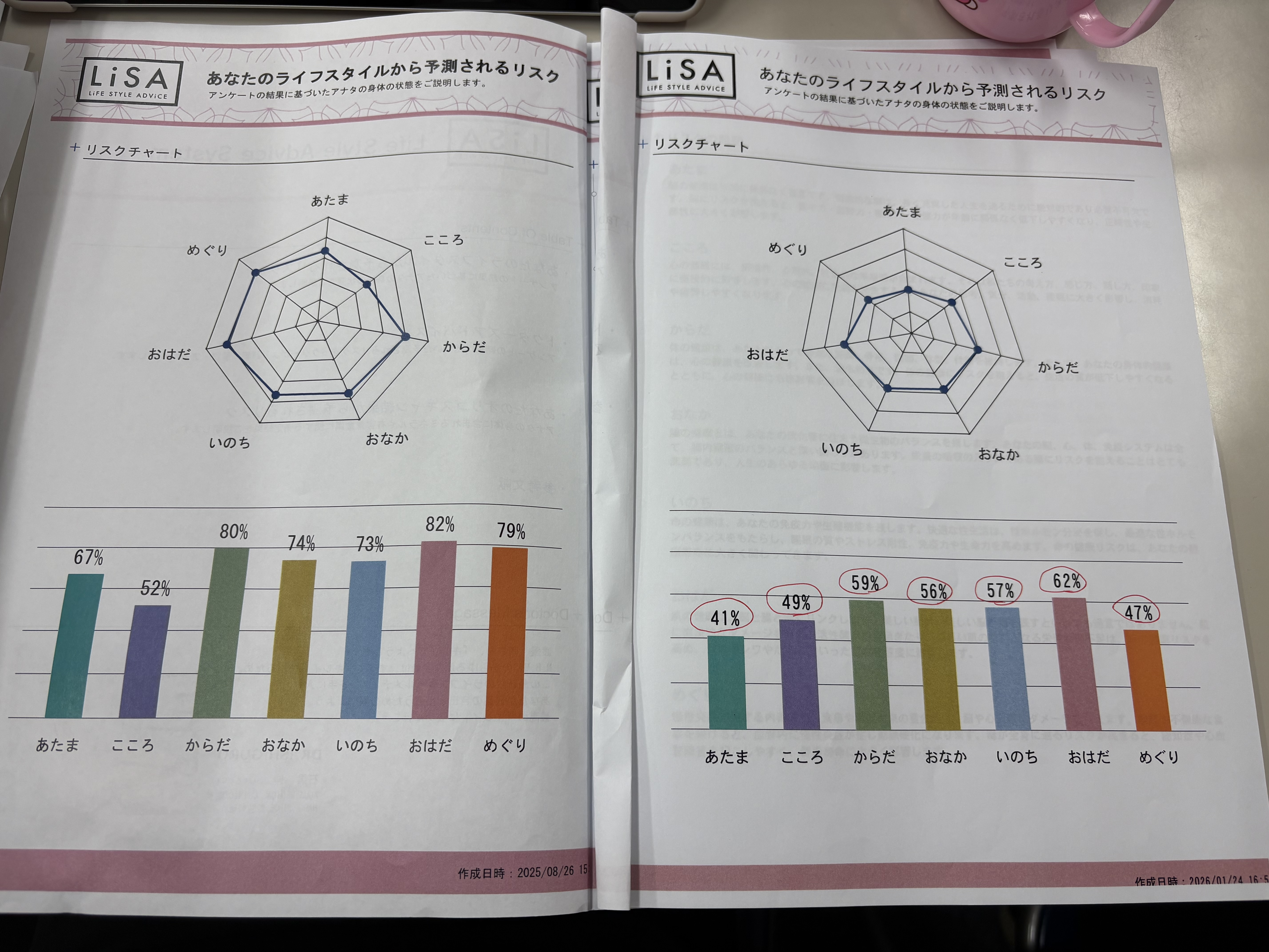 約半年後の結果が右です!全てのリスクが減り、何と、あたまとこころ、めぐりのリスクは50%を切ることができました🤭💕