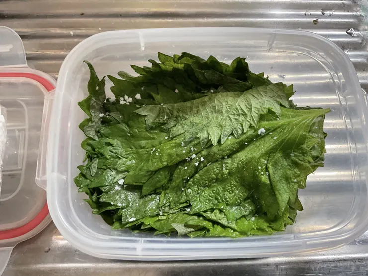 綺麗に洗ったシソの葉の水気を綺麗に取り、広げてタッパーに入れます。