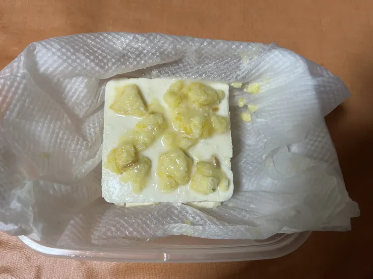 ②レモン塩を豆腐につけて、キッチンペーパーに包み、1〜2日待つ