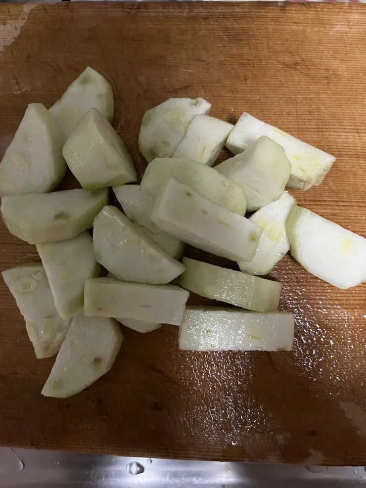 で、ナス🍆やピーマン🫑などと一緒に味噌炒め煮?に。小さく切り、赤味噌を使ったのでどれだか分かりにくい(真ん中の半月のようなの)ですが、初めて食べました😋