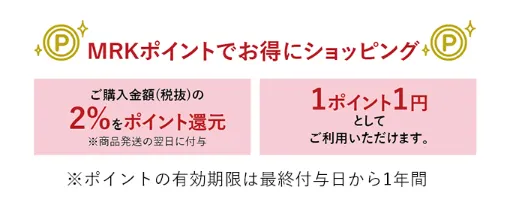 MRKポイントは、ご購入金額の2%をポイント還元しており、1ポイント1円として店頭やオンラインショップでご利用いただけます。