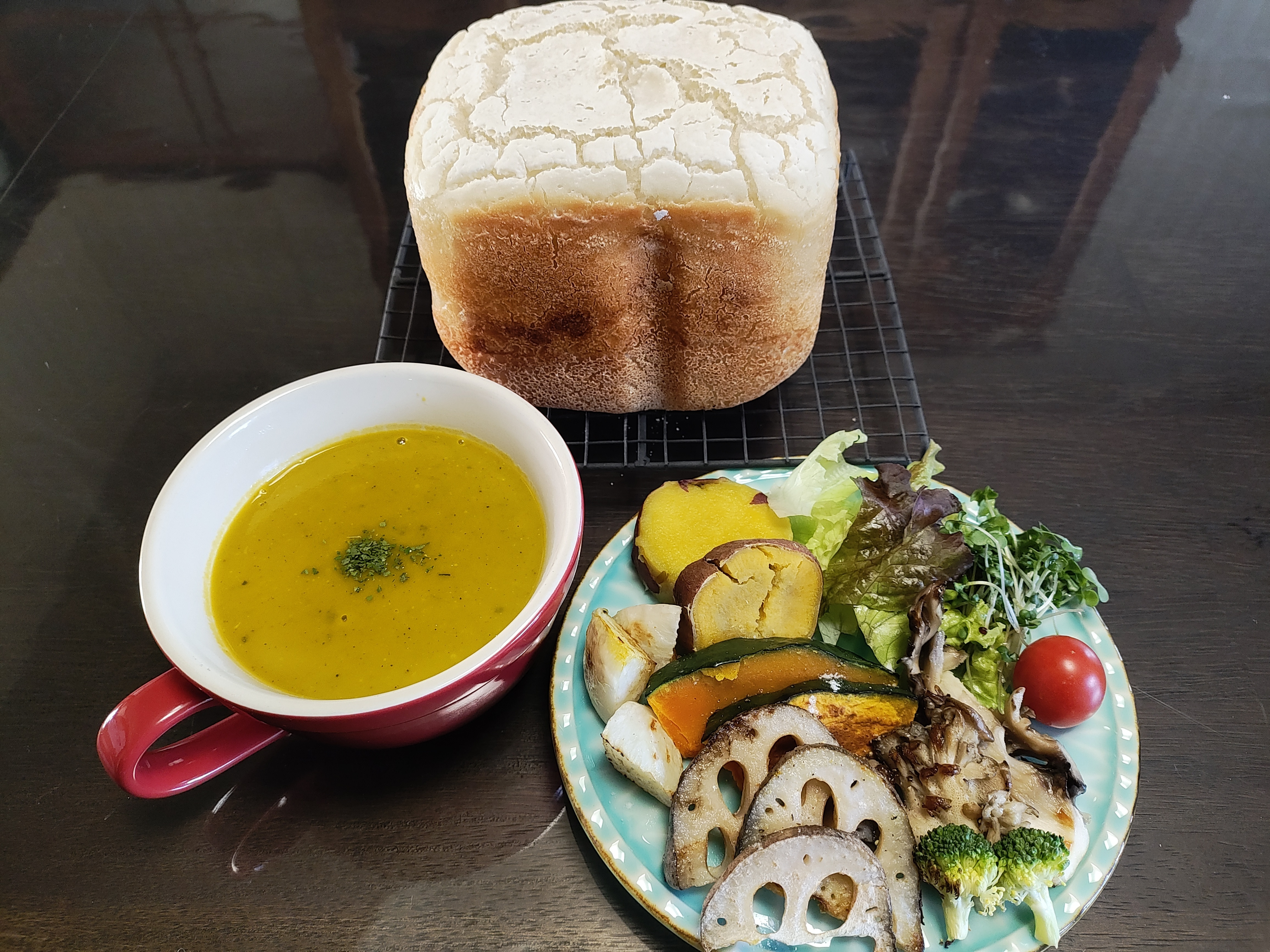 投稿を表示かぼちゃスープ、野菜、さつまいも🍠そして🍞100%米粉パン美味しそう~😍