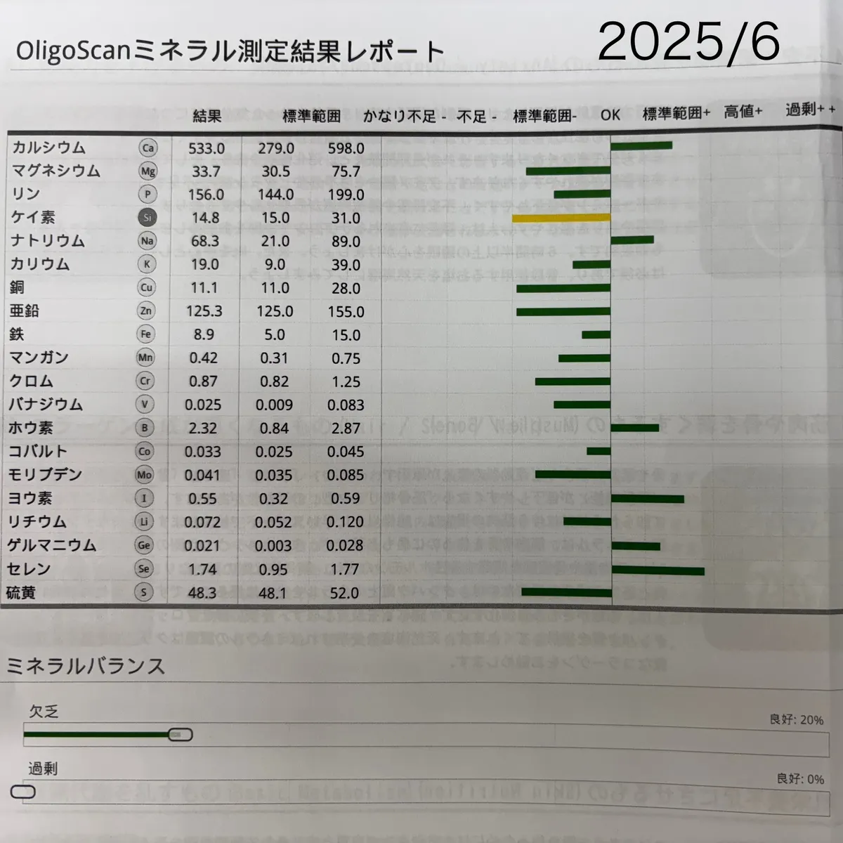 その後カウンセリングをしていただき、PHYTO POWERはお守りとして、KETO ADK、Daily VEC、 COLLAGEN、そして2025年3月からSHiLA-F itを入れた事で凄く変化して、2025年にはなんとミネラルの赤いラインが、消えてました✨