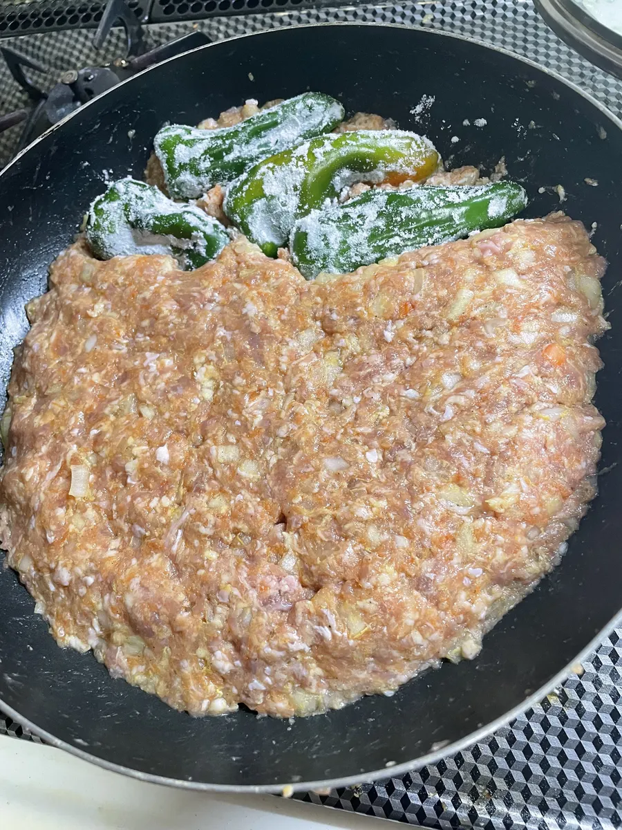 ピーマンから、お肉溢れ出るくらいボリュームたっぷりに出来上がりました😋