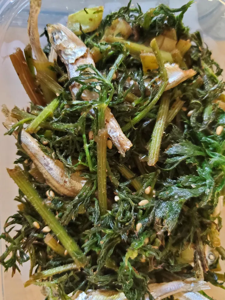 小魚が大きくて(笑)食べづらいし、ちょっと苦い😅職場の人に味見してもらったら、小魚を少し煎れば苦味が抑えられると💡