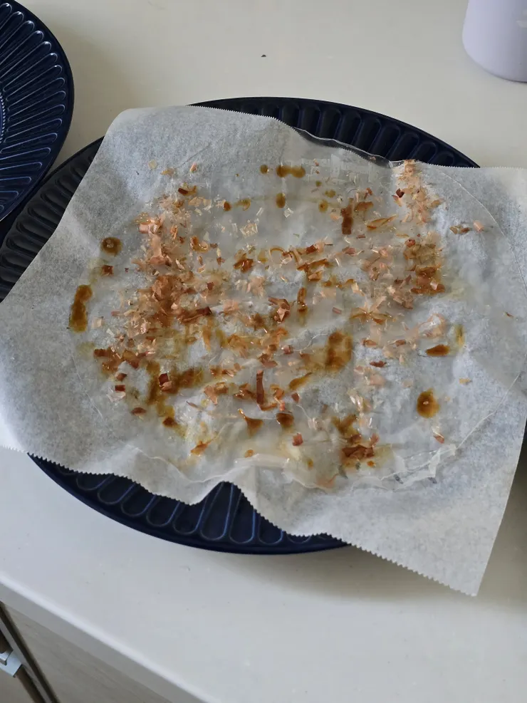 ②別の平たい皿にキッチンシートを引いた上に①をのせて、鰹節と醤油、青のりと塩などお好みの素材をライスペーパーにまぶす。