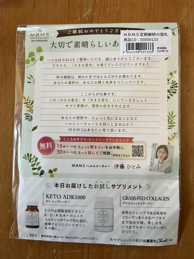 今日 DailyVECが切れたので、定期の25日便分を開けたらKETOADK1000とグラスフェッドコラーゲンのサンプルが😊