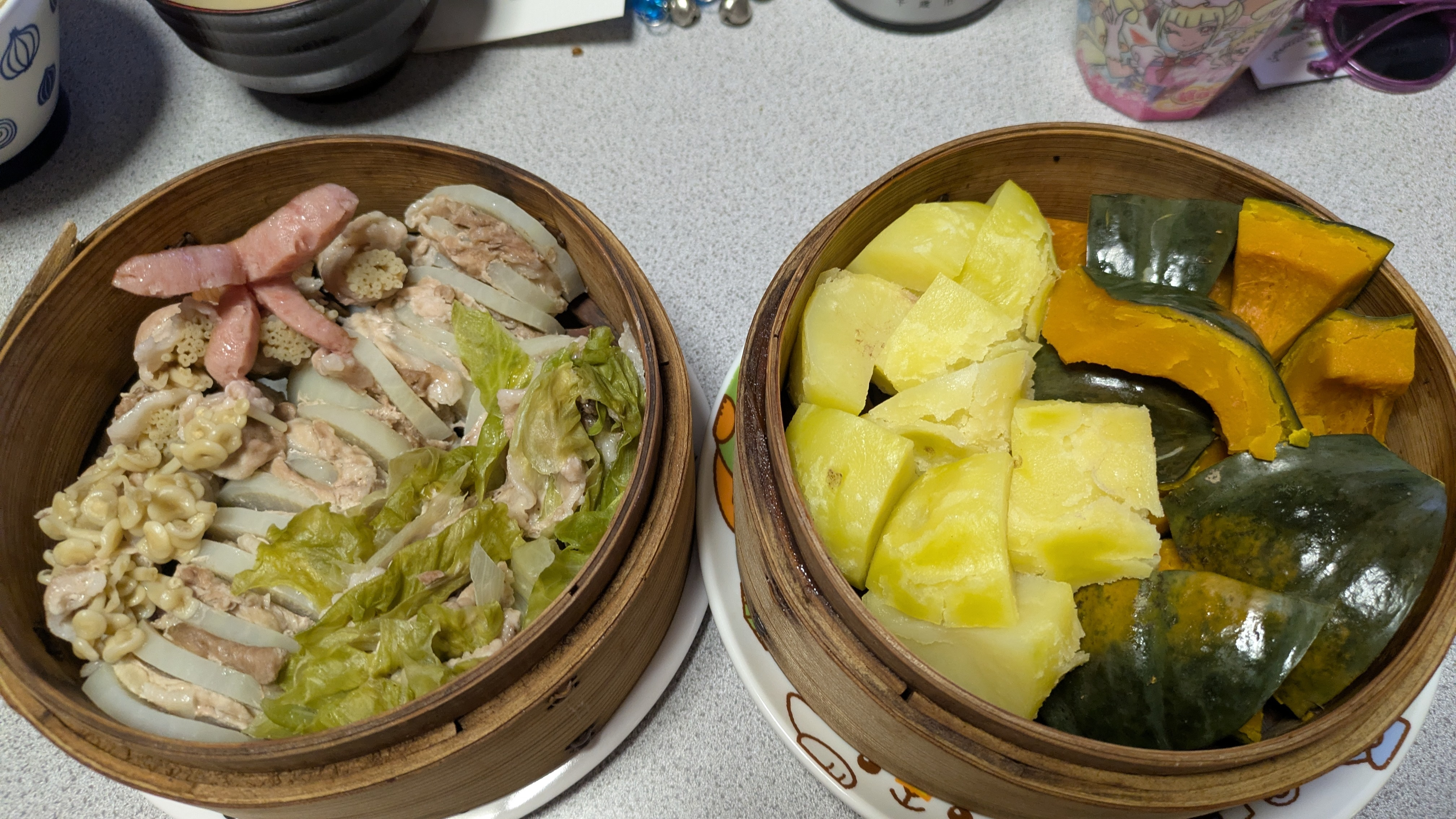 トップ > みんなの声 > 食べたもの > 久々のせいろ カトーさん 2025/11/24 20:47 久々のせいろ 画像がおさまってなーい(笑) 昨日はラムしゃぶ食べ放題だったので、 今日は野菜が食べたい! でも、肉がないと家族からクレームが来る。 なので、芋とかぼちゃは蒸すだけ。 大根と豚のミルフィーユ、レタスと豚のミルフィーユ、エノキの豚巻き ヘルスタウンに行きたい娘作「私専用タコさんウインナー」。 家族4人でせいろ二段はいつもは足りないのですが、今日は芋とかぼちゃで大満足! 最近は、鍋の中のお湯で汁物も作ってます。 出汁が出て美味しいんですよ。 いいね 共有する 共有する X facebook LINE リンクをコピー コメントする 4 件の返信 (新着順) ミュートしたユーザーの投稿です。 投稿を表示 Aka(赤﨑) ヘルスコーチャー 2025/11/26 08:12 せいろ蒸し、良いですよね。 私も毎日のお弁当もせいろでしてます。 今朝は、人参🥕さつまいも🍠ゆで卵🥚 カトーさんの様に凝っていませんが…💦 でも、見習って、ミルフィーユしてみます。 いいね 返信する ミュートしたユーザーの投稿です。 投稿を表示 カトーさん 2025/11/26 13:10 Aka(赤﨑) 弁当は、シリコンのカップの中でミルフィーユします! 私もきょうは、たまごとしめじ、えのきを蒸して、残ったおゆで豚しゃぶサラダでした! いいね 返信する ミュートしたユーザーの投稿です。 投稿を表示 hisshi 2025/11/25 06:34 せいろを買って未使用なんですが💦 蒸したあとのお湯も利用するなんて…🤔 たしかに👍具材のエキスを捨てたら勿体ないですね。美味しい汁物が、出来そうですよね😋 豚肉も3種類のお野菜と一緒に摂れていいですね😋 いいね 返信する ミュートしたユーザーの投稿です。 投稿を表示 カトーさん 2025/11/25 07:47 hisshi せいろって使うまでなんとなく気合いいるんですが、使ってしまえばこっちのもんです。 とりあえず、根菜と卵そのまま入れて蒸してみてください! なんかオシャンだけど美味しいのできあがります! いいね 返信する ミュートしたユーザーの投稿です。 投稿を表示 OKD🔰岡田 ヘルスコーチャー 2025/11/24 22:12 ミルフィーユいいですね✨ めちゃくちゃ美味しそうです🤤 ジャガイモとカボチャのホクホクさが写真で伝わります😍 いいね 返信する ミュートしたユーザーの投稿です。 投稿を表示 カトーさん 2025/11/24 22:49 OKD🔰岡田 じゃがいもはうちの畑産、 かぼちゃは友達のばあちゃんち産です! 安心安全の家庭菜園です! いいね 返信する ミュートしたユーザーの投稿です。 投稿を表示 野口 2025/11/24 21:00 とても美味しそうです♪ミルフィーユいいですよね!この季節になりました。 ちなみに何かつけて食べたんですか?タレ いいね 返信する ミュートしたユーザーの投稿です。 投稿を表示 カトーさん 2025/11/24 21:46 野口 我が家は何もつけません。 素材の味で味わっていただきます! 考えてみれば、それでも子供たちは文句も言わずに食べていたので、そういうものだと思ってるんだと思います! いいね 返信する ミュートしたユーザーの投稿です。 投稿を表示 野口 2025/11/24 21:52 カトーさん 素晴らしいです👏子供達もその味に慣れてる事もすごいです。私もつけずに食べます。強いて言えばお酢くらいですね。素材の味大事です😍 いいね 返信する