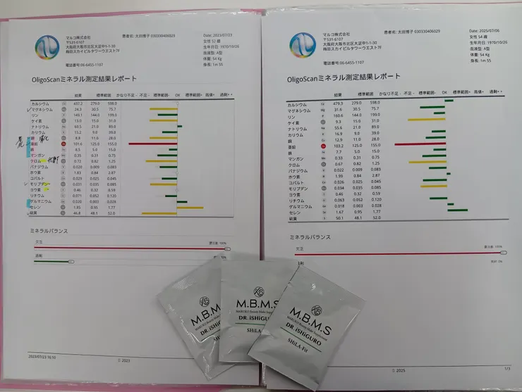 そして、ヘルスコーチャーに2年ぶりのオリゴスキャンを測定して頂きましたところ、ミネラル不足が改善され、有害金属の含有量が減っておりましたぁ~!