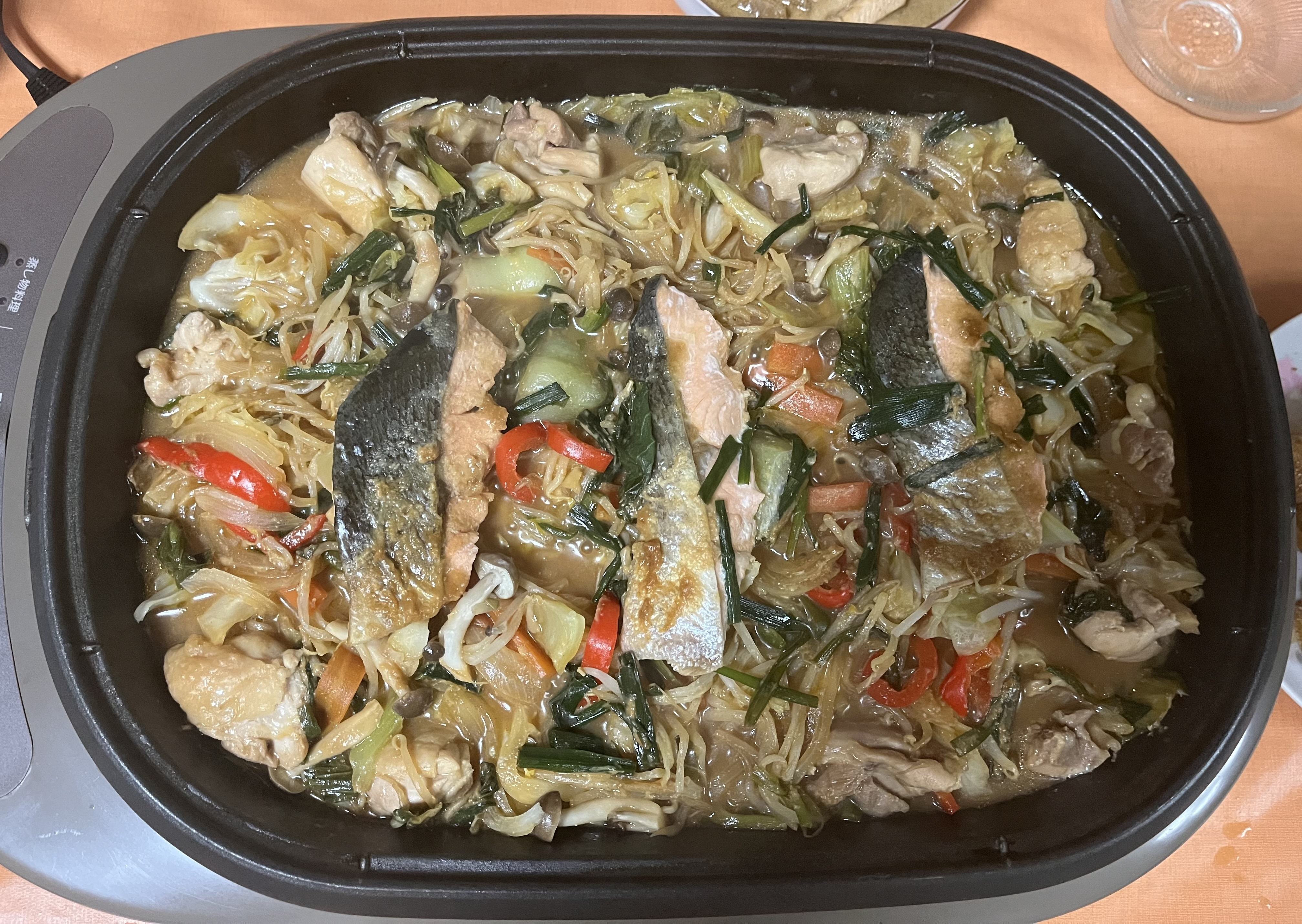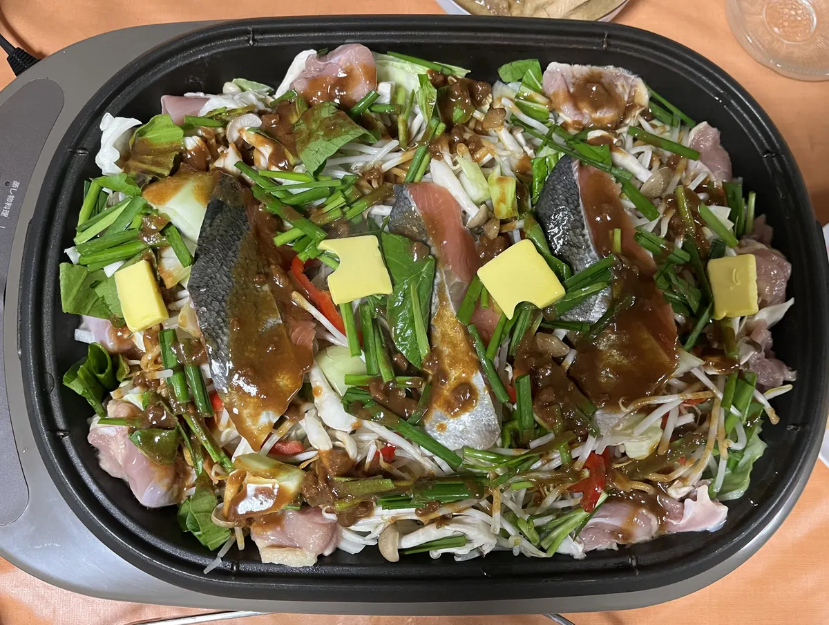 先に鮭を焼いてから、野菜の上にのせるようですが、私のスタイルは具もたれ(味噌・ラカント・みりん・酒)もバターも全部のせの蒸し焼きです😅