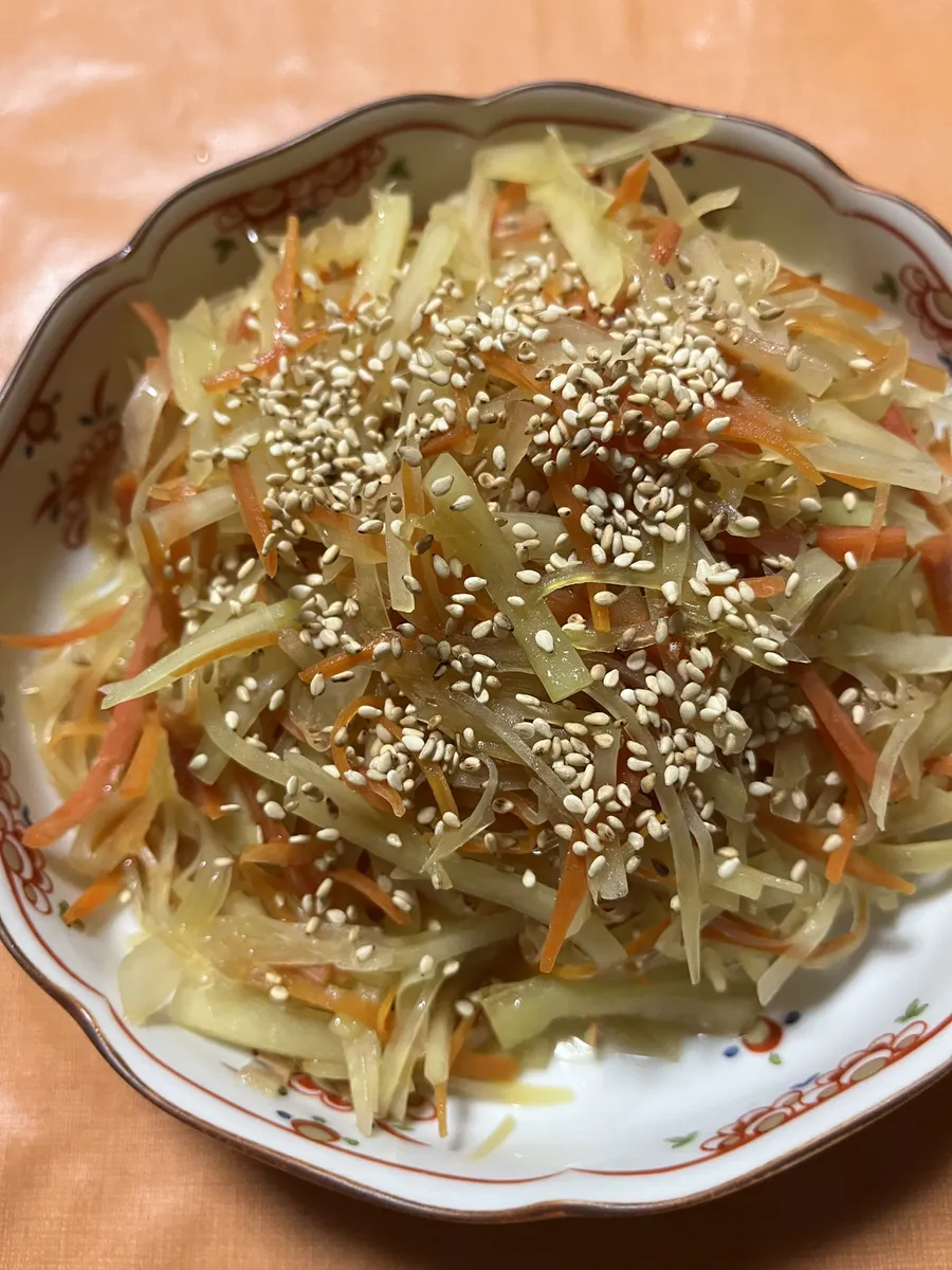 サラダ🥗で食べようと思いましたが、曲がった部分で千切りがの太さがバラバラだったので💦カラーにんじん🥕とで、しりしりか?きんぴらか?で迷いましたが、きんぴらにしました😄