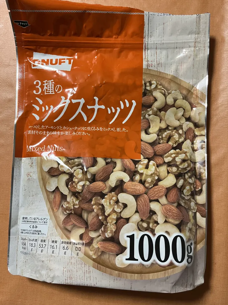 ミックスナッツは、ザ・ビッグで1000g入りを買い、容器に小分けして食べています。