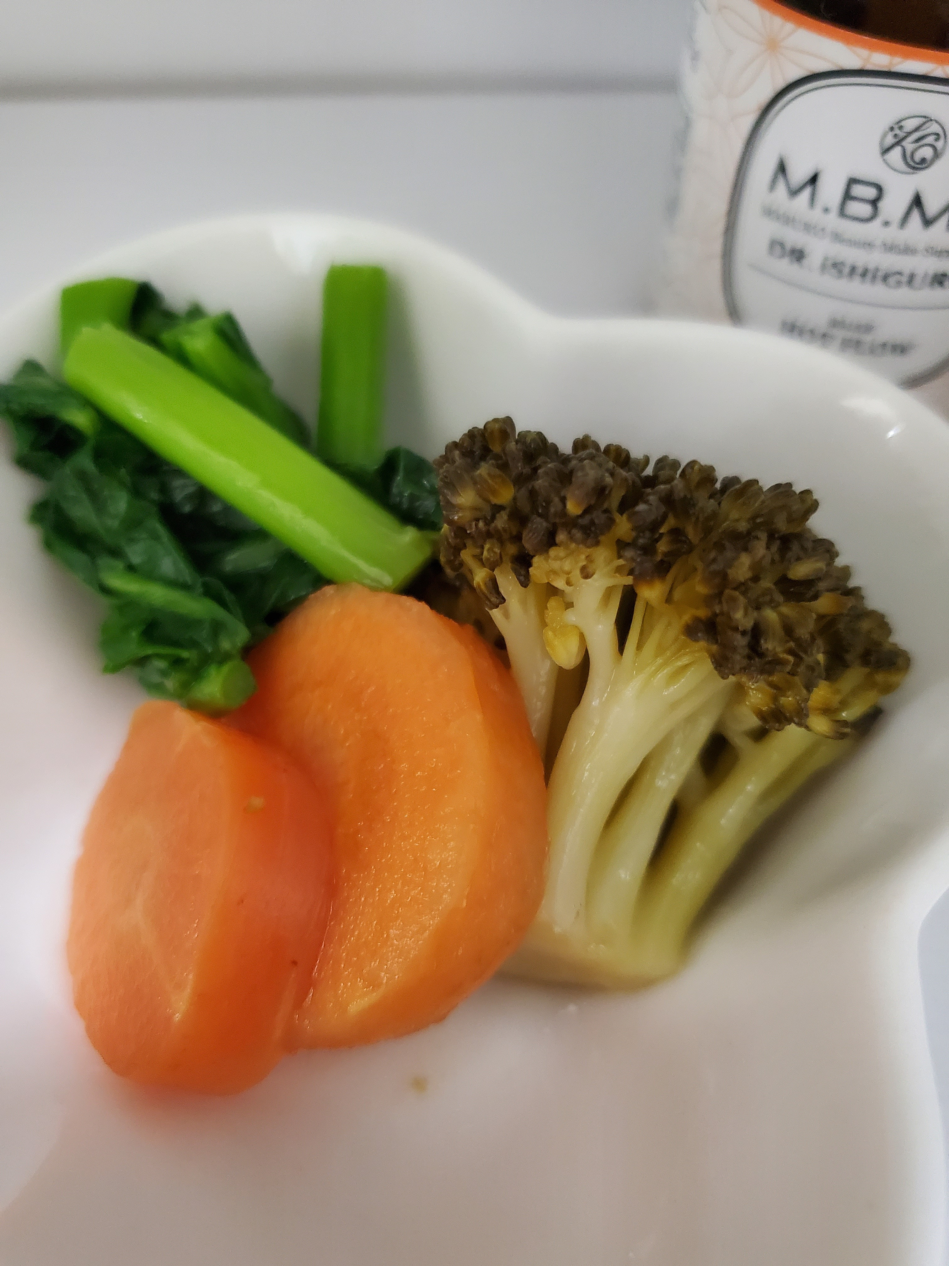 いただき物のブロッコリー、人参、かき菜。手作りの梅酢