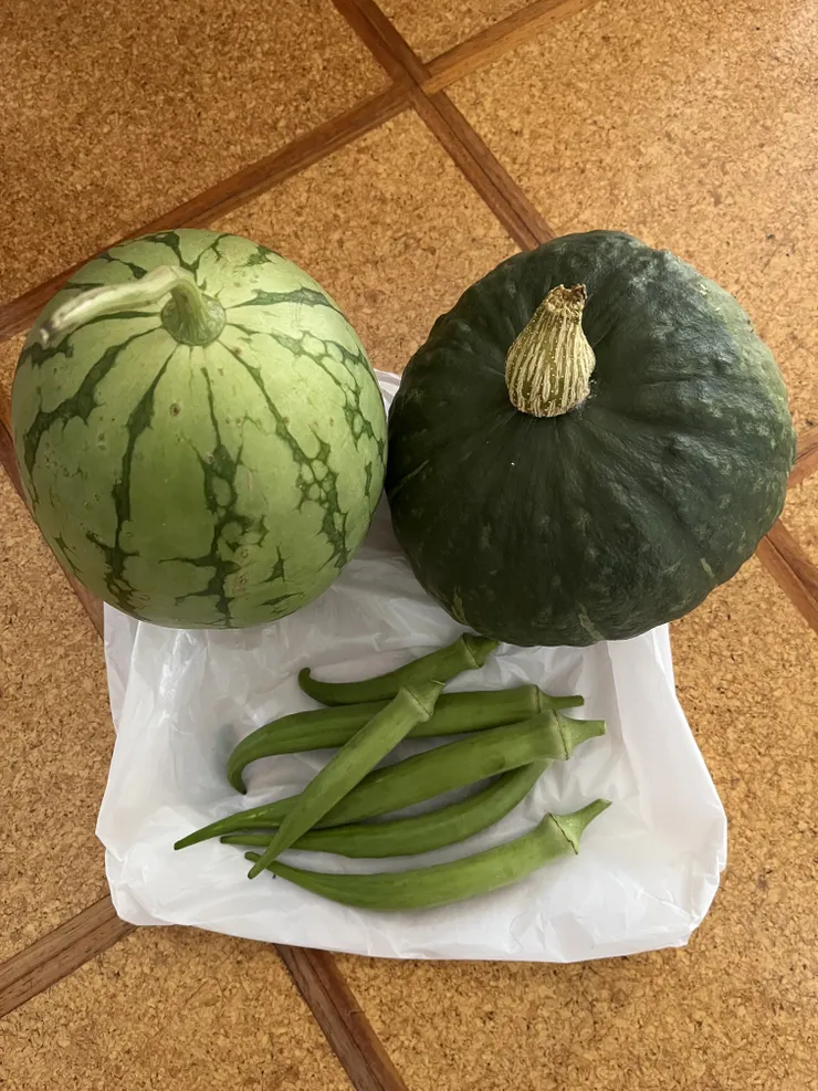 主人の職場の方から、スイカ🍉とカボチャ🎃・オクラを頂きましたので、小玉なのでスイカを仏壇に供えていましたが、落下してしまいえんでしまったので、切ってみると黄色いスイカでした😊
