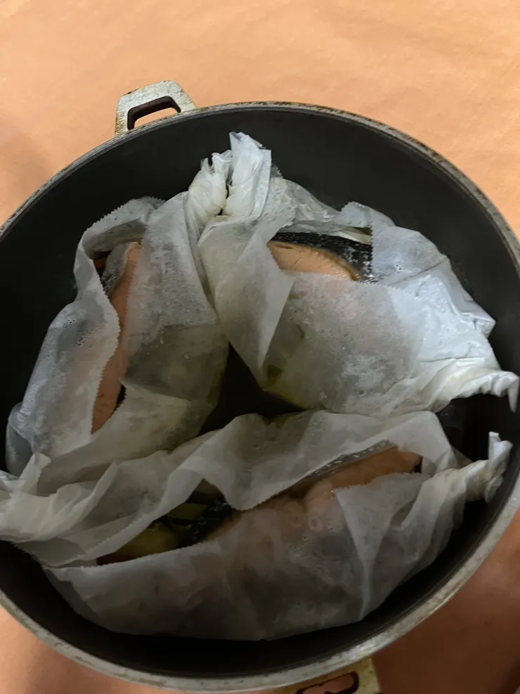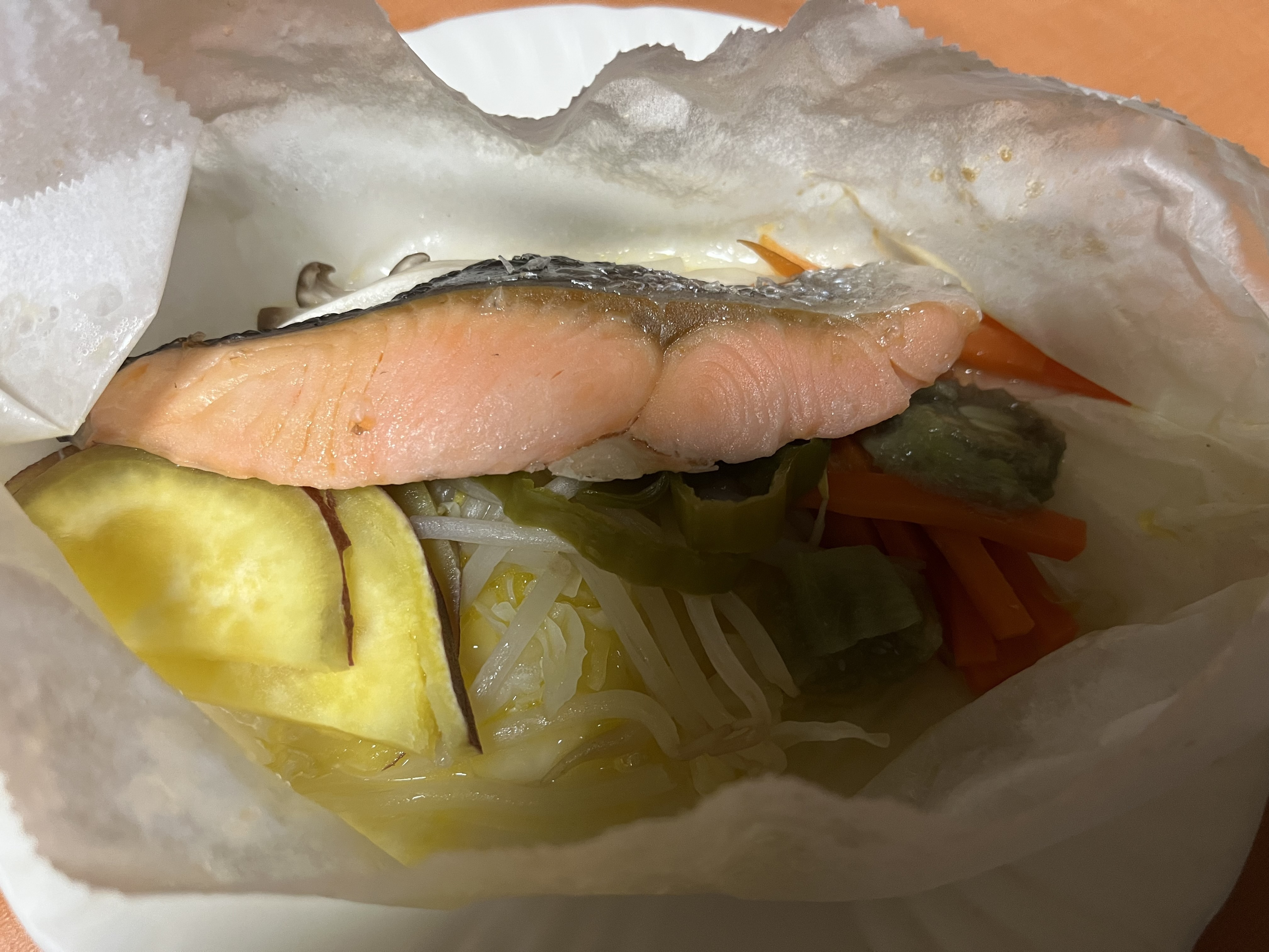 塩鮭でしたので味付けなしで、お野菜(分かりにくいですが、さつまいも🍠、もやし、茄子🍆、にんじん🥕)と無塩のグラスフェッドバターをクッキングシートに包み、蒸し焼きにしました。