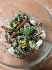 タイトルが長いですが💦れんこんサラダを作りました😃レシピ以外のお野菜なども加えました。 ・れんこん・にんじん🥕・ほうれん草 ・赤パプリカ・スナップエンドウ ・ひじき・無添加ツナ ・茹でたまごのぬか漬け マヨネーズは、平飼いのたまごで作りアミノ酸等の調味料を使っていないものにしました。&nb