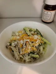 柿の卯の花和え 🍴食べたもの🍴柿 きゅうり しめじ しらす おから 酢和え■□■ちょっと意識したこと■□■戴きものの柿。家の前に住んでいる親戚が、最後だよ~と持ってきてくれた、きゅうり。近くのスーパーで安くなっていた国産大豆のおから。しめじは茹でて、しらすを入れて、酢で和えただけです😅今日も知り合いのおばあちゃんに