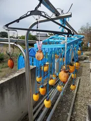 💡発見・チャレンジ💡一週間前に収穫した知人宅の渋柿手前の3つは、割れちゃったり柔らかめだったので、その日に皮剥いて、紐付けて、干したものです。(わかりづらい😅)干し柿作りは暖かいと腐るので、気温が13℃以下だけど、柿が柔らかくなってしまったので、洗って皮剥いて枝があるものは枝を紐で縛って、枝がないも