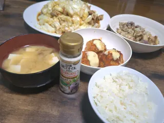 今夜の晩御飯! 皆様 こんばんは 我慢せず 食べたい時に 食べる 大切な事 なめこ、豆腐の味噌汁 豚バラ肉の回鍋肉風 トマト&チーズの肉団子 焼鳥三昧、 ご飯。 (MCTオイル 大半食べましたが 追い納豆と茹玉子を 食べて おかず 少々残