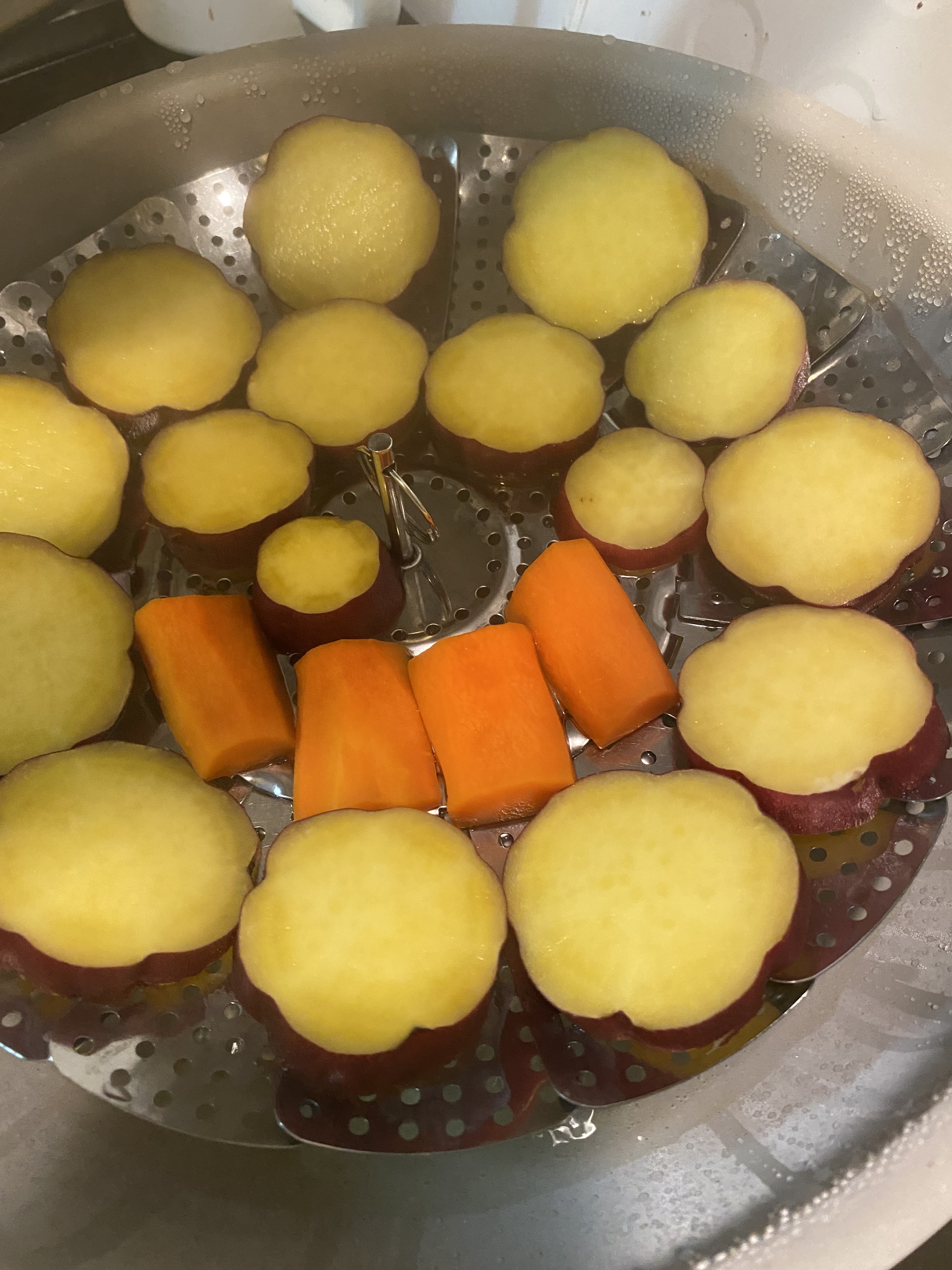 さつまいもを少ない量で広げて蒸した方が美味しい気がして、さつまいもとその他の野菜を分けて蒸してます😊このさつまいもは2〜3回に分けて食べます🍠